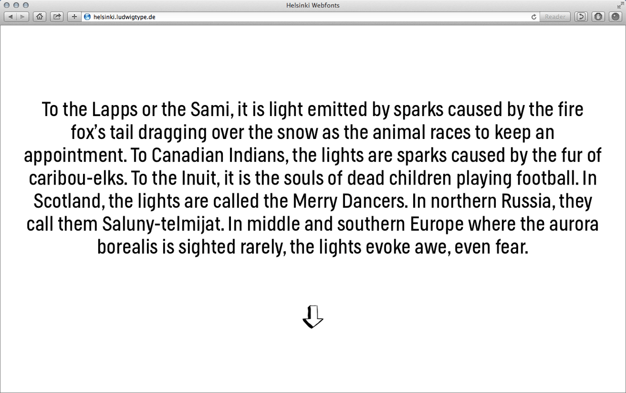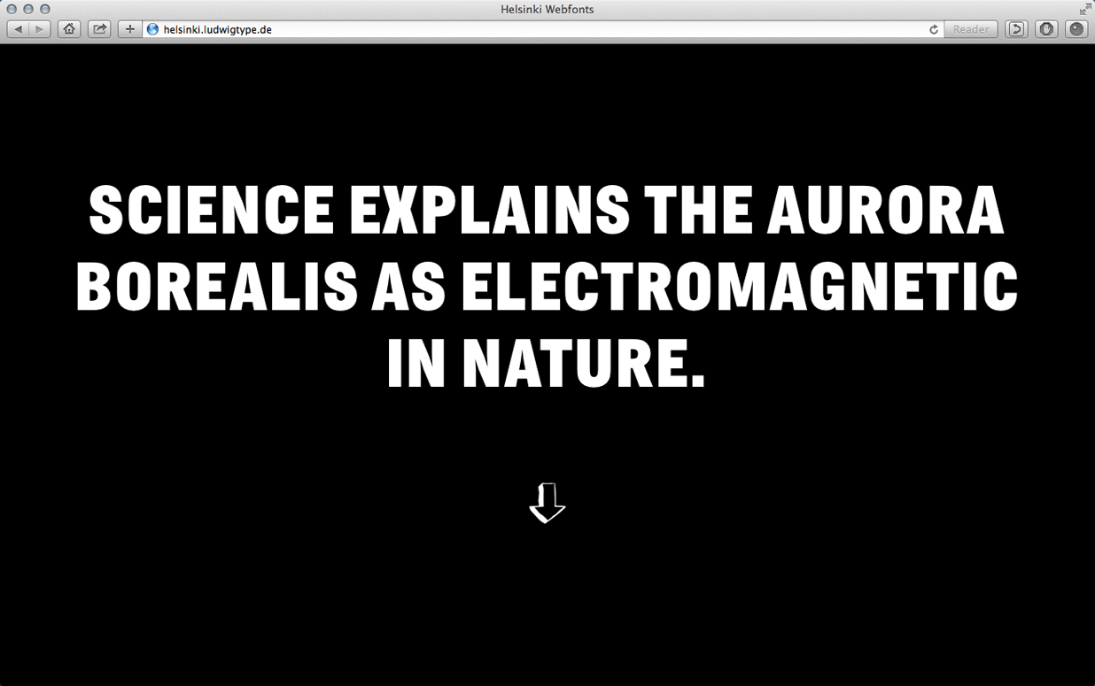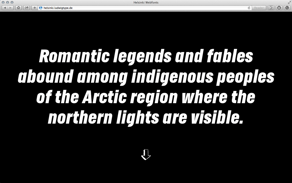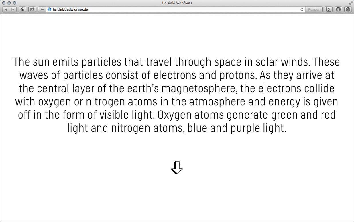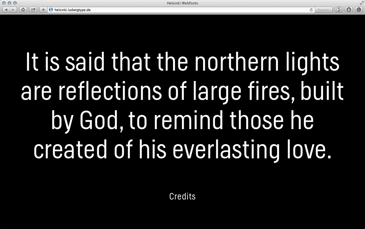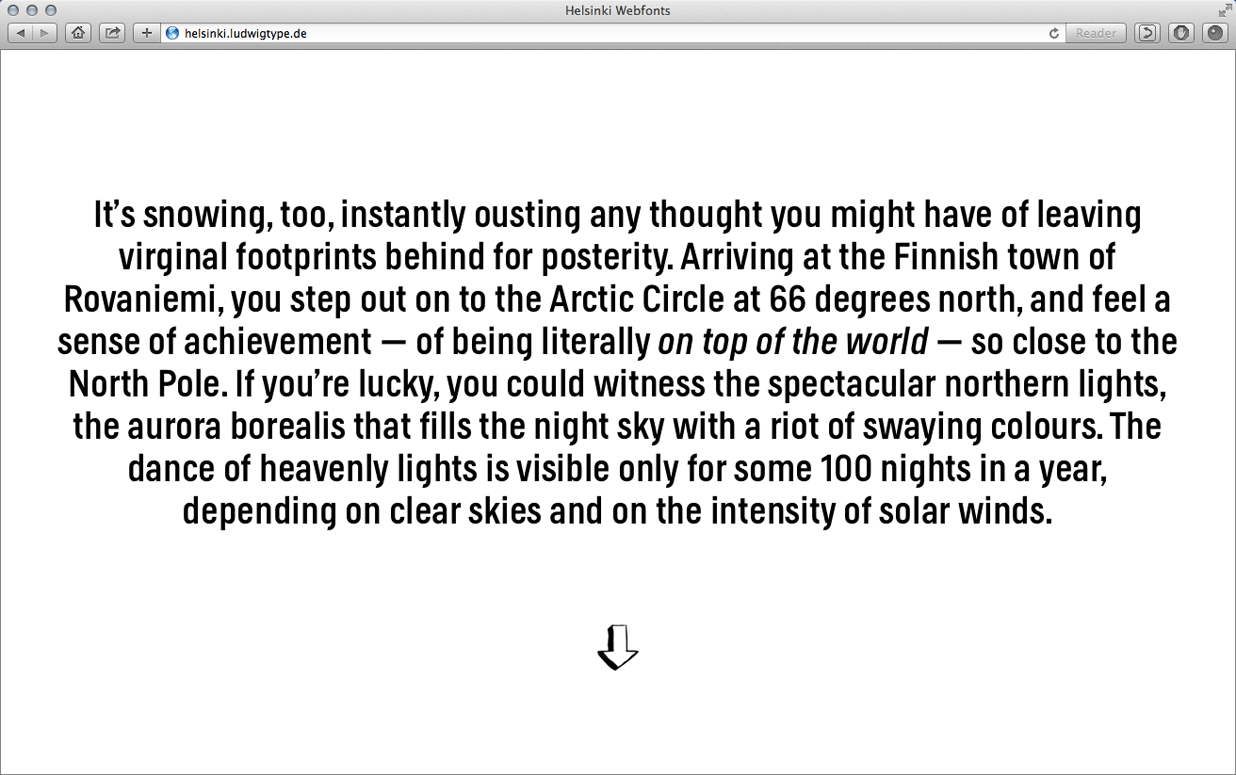 Helsinki is inspired by the Finnish traffic sign typeface. Like other classic wayfinding typefaces the Finnish signs featured rather crude, constructed letterforms. Compared with the original design Helsinki is optically more balanced, without losing the specific character of the typeface. I designed the first style of the typeface during my stay in the north of Finland in 1998. Later I completely updated the typeface, expanded the character set, revised the weight range and added italics. Helsinki fonts are optimized for on-screen reading and available for the web. This little webpage shows the Helsinki webfonts in action and tells about the magic of the Finnish winter nights.