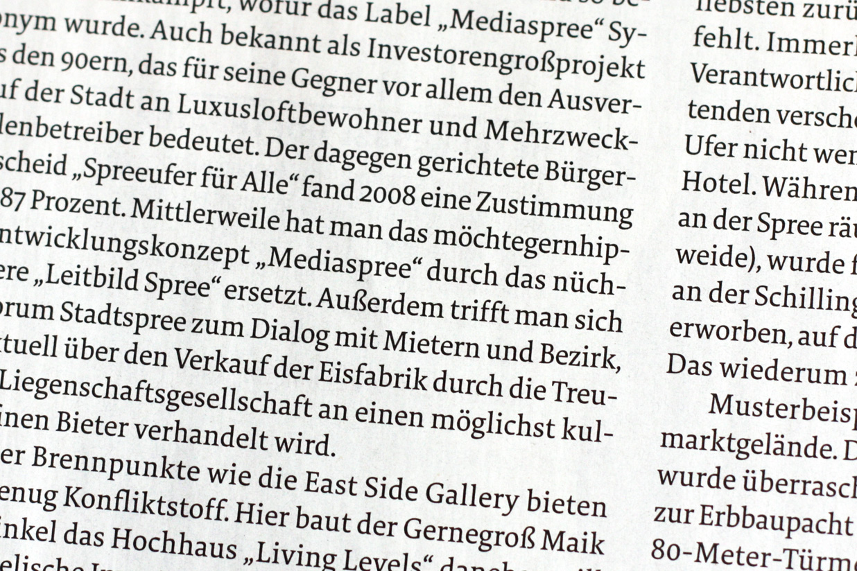 The word has spread that FF Tundra is an excellent typeface for editorial. After the German magazine stern now also Berlin city magazine tip is using the typeface for body text and headlines. FF Tundra is a friendly and highly legible serif typeface. Its characteristics are soft letter forms, narrow proportions, strong serifs and open counters. This makes it especially suitable for magazines with its narrow columns and complex typography.