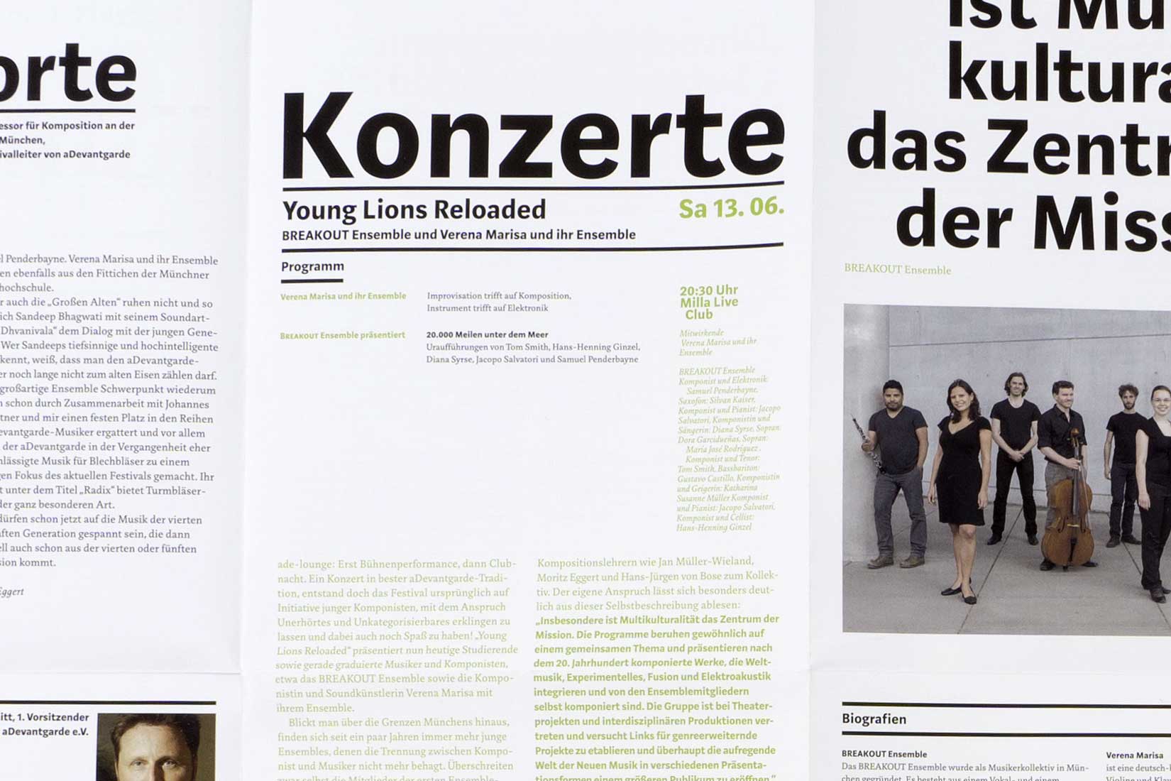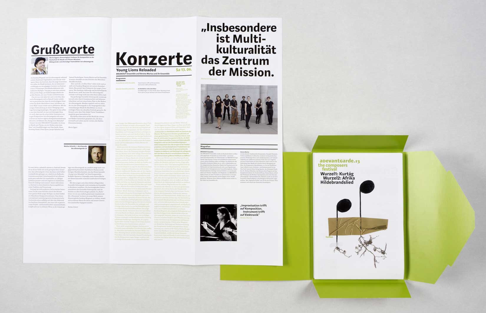 Visual identity of adevantgarde, the 13th international composters festival in Munich, featuring Marat and Marat Sans. The motif: humus, fertile soil and past, from which new things emerge again and again. Designed by Büro Alba.