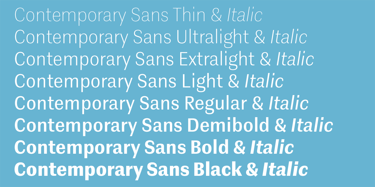 Contemporary Sans is a unique grotesque with a distinct contrast between its horizontal and vertical strokes that gives it a lively and elegant appearance. Friendly, subtly formed strokes and individual letter forms make it both legible and pleasant to read at small sizes, and striking at display sizes. Its narrow proportions make it a very easily useable typeface, particularly for narrow columns or tight headlines. It is suited to a wide range of applications, from corporate to editorial design, where a clear and distinctive impression is required. The type family contains 16 styles and weights, covers all major languages using Latin characters, and includes a wide range of OpenType features. Contemporary Sans fonts come for both desktop and web.