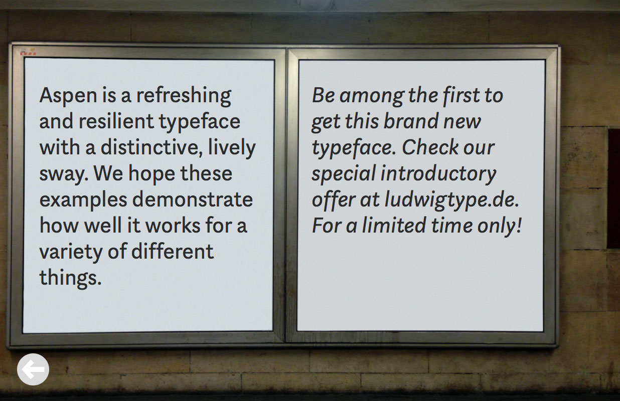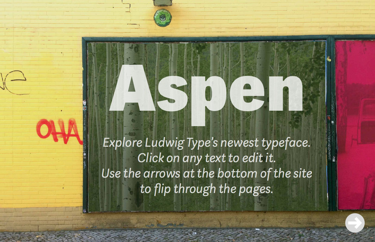 I designed a little minisite to show the Aspen web fonts in action. You can type your own text and adjust the settings. You also can share your customized image on Facebook or on Twitter. Try it, it’s really fun! Visit the Aspen minisite