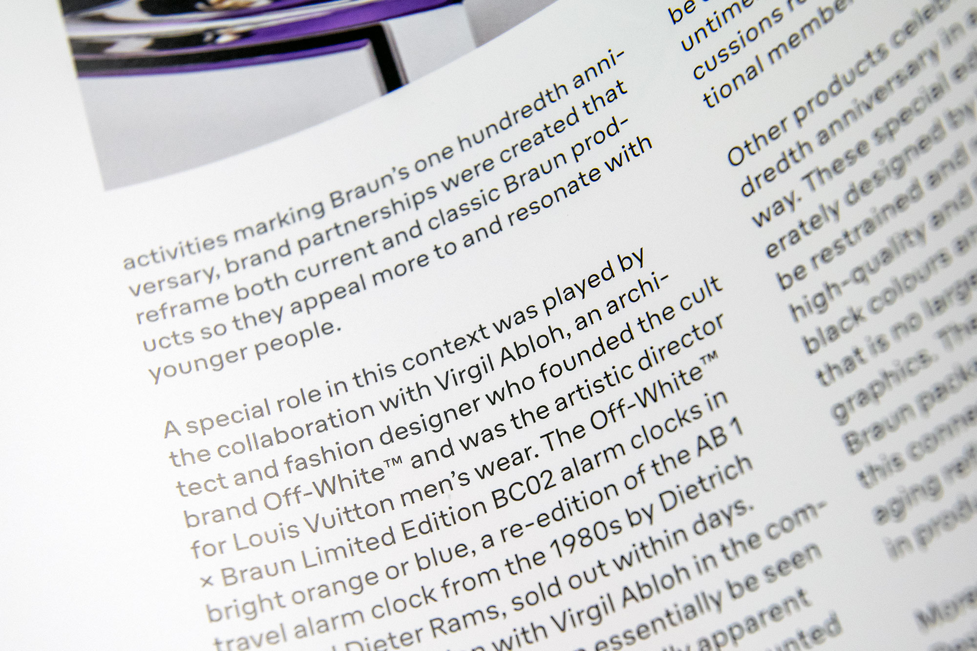 On the occasion of its 100th anniversary, we developed an custom typeface that reflects Braun’s philosophy. The design of Braun’s products hinges on two fundamental pillars: technology and people. The company develops devices for everyday life, technical products for people. These two core aspects are prominently reflected in the design: technical and rational with a focus on the essential, while also being human and very useable. The new typeface reflects this: technical, functional, rational and clear on the one hand. Open, friendly and warm on the other.