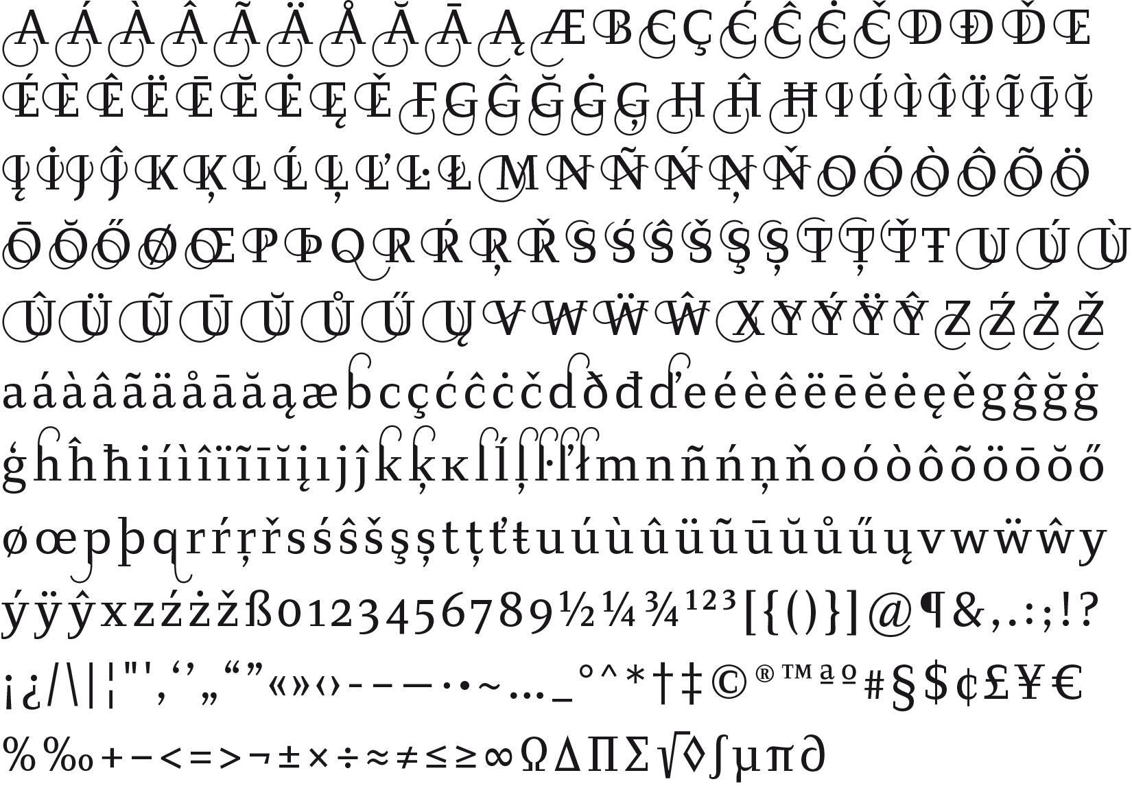 Diogenes Decorative fonts contain characters for all major languages using the Latin alphabet. Below for instance you can see the character set of Diogenes Decorative Regular 1. Additionally, each font contains a varying number of alternates and swashes. Please see the About page for details.